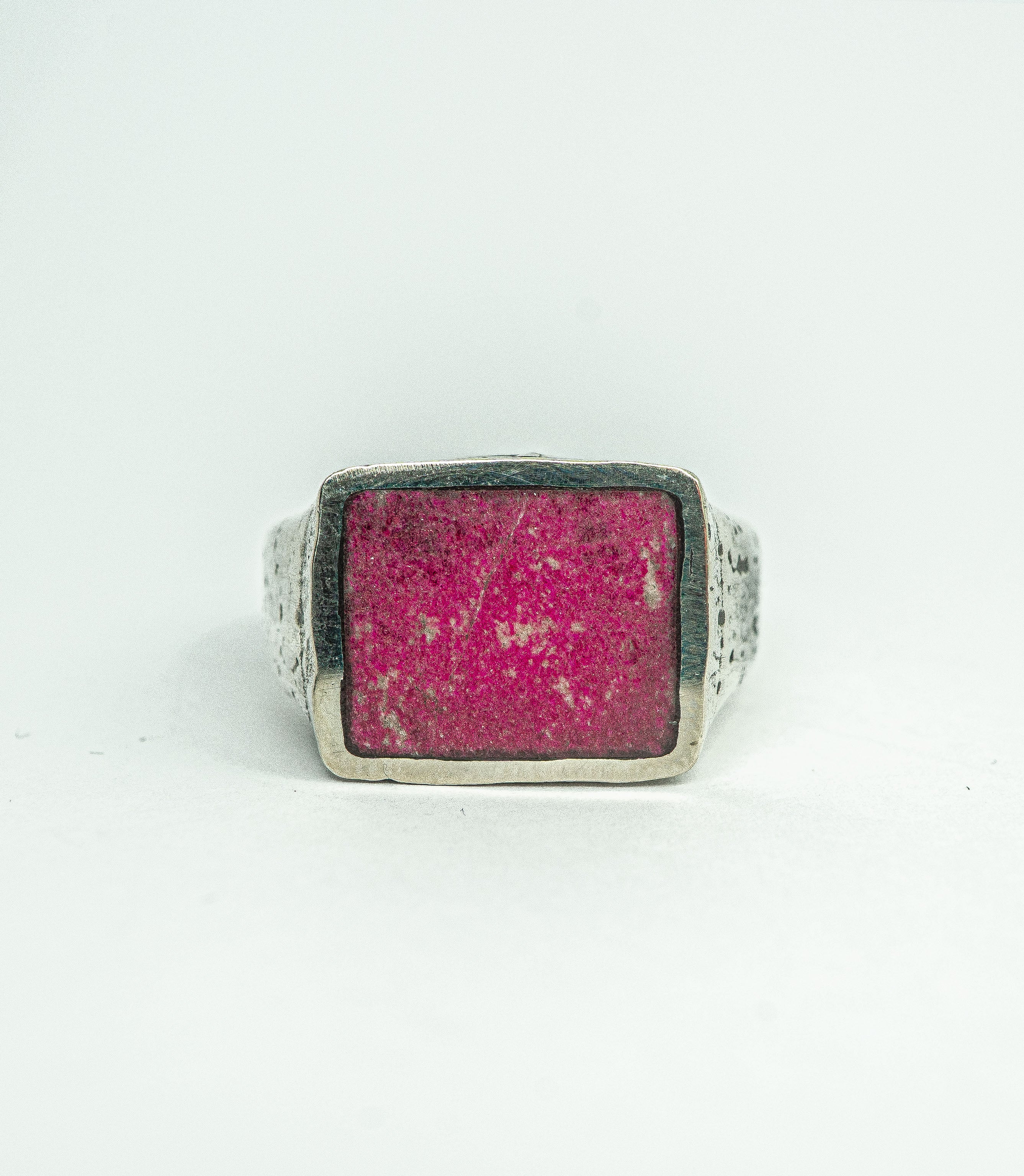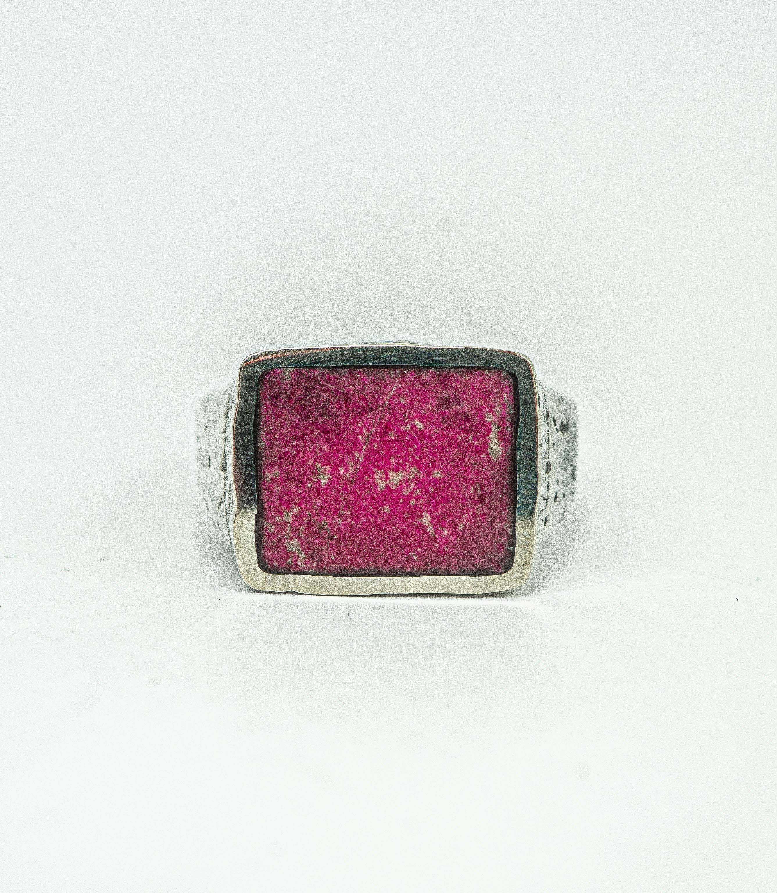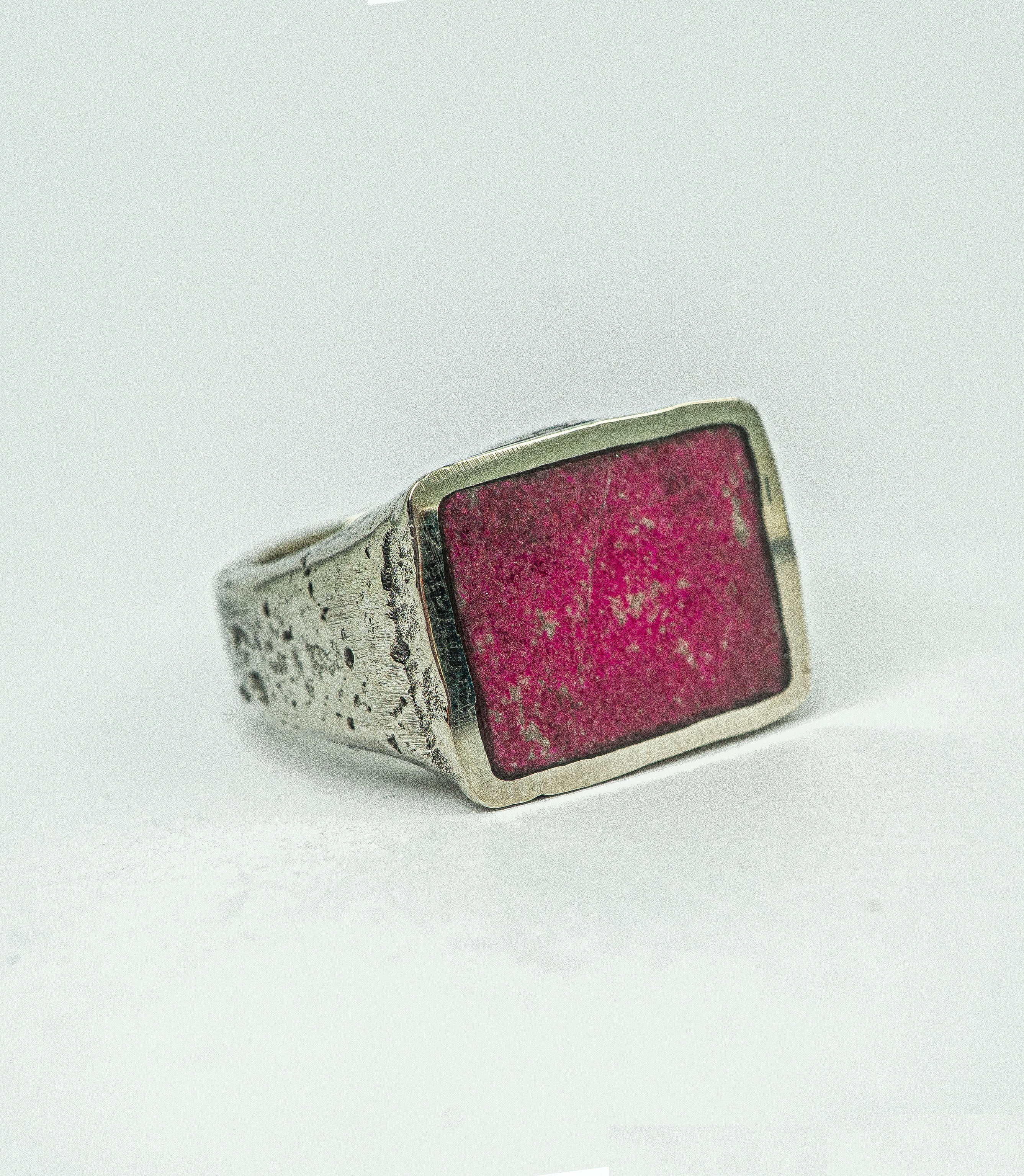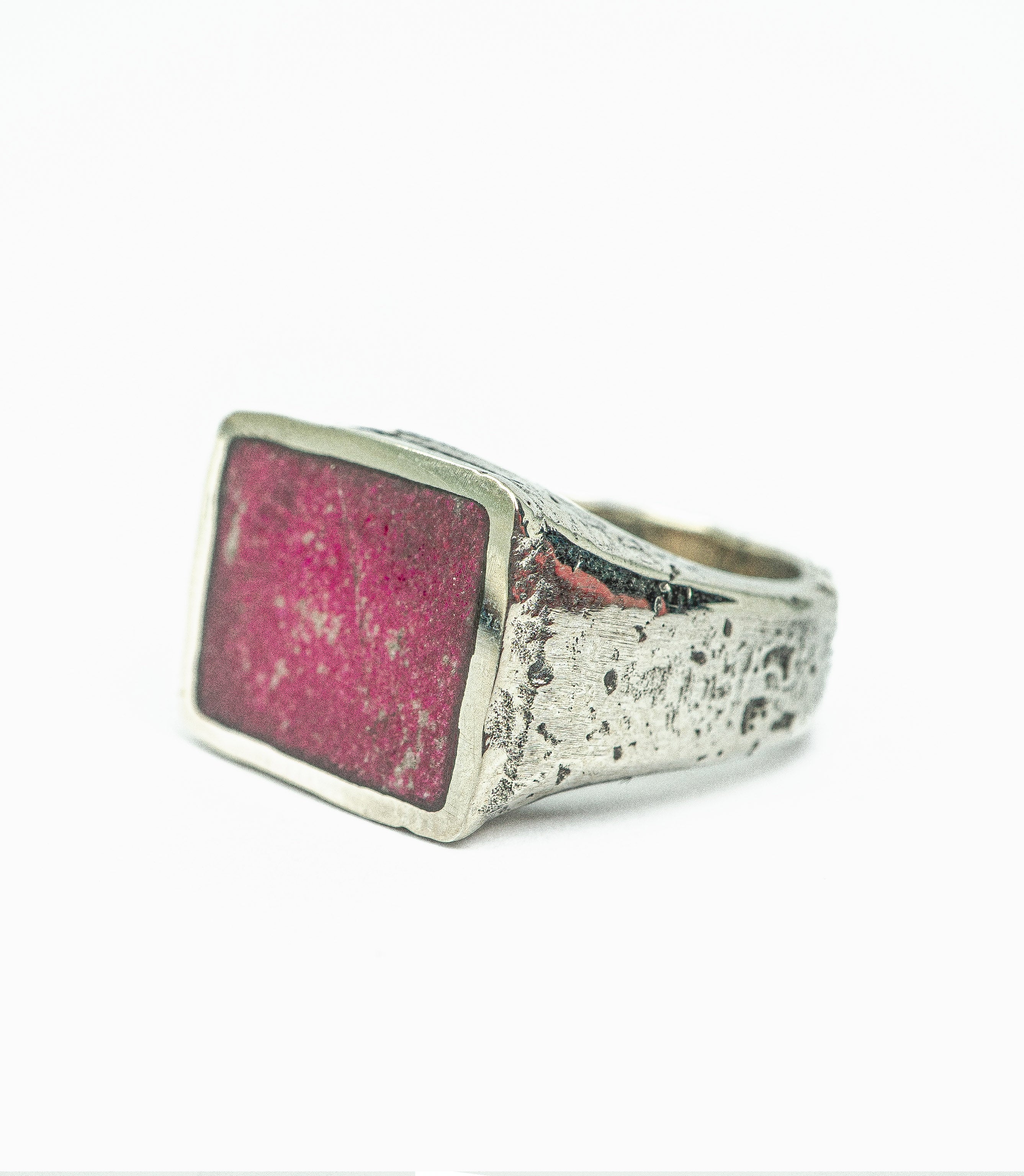 Set with a 100% natural Thulite stone, hand-cut and bezel-set to preserve its wild texture and mineral veins.