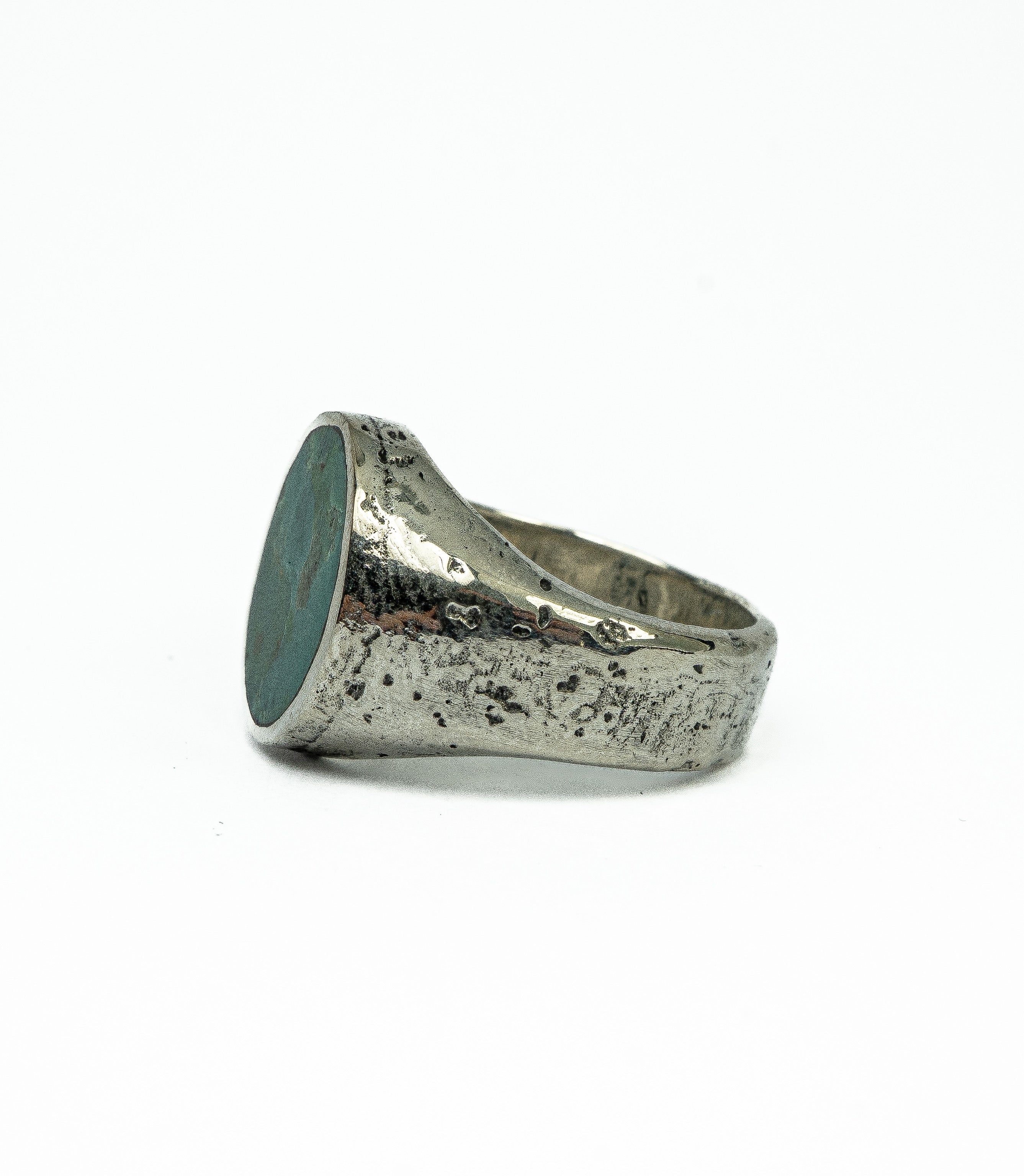 A heavy-set signet ring with a crater-textured band, forged to look unearthed and timeworn.