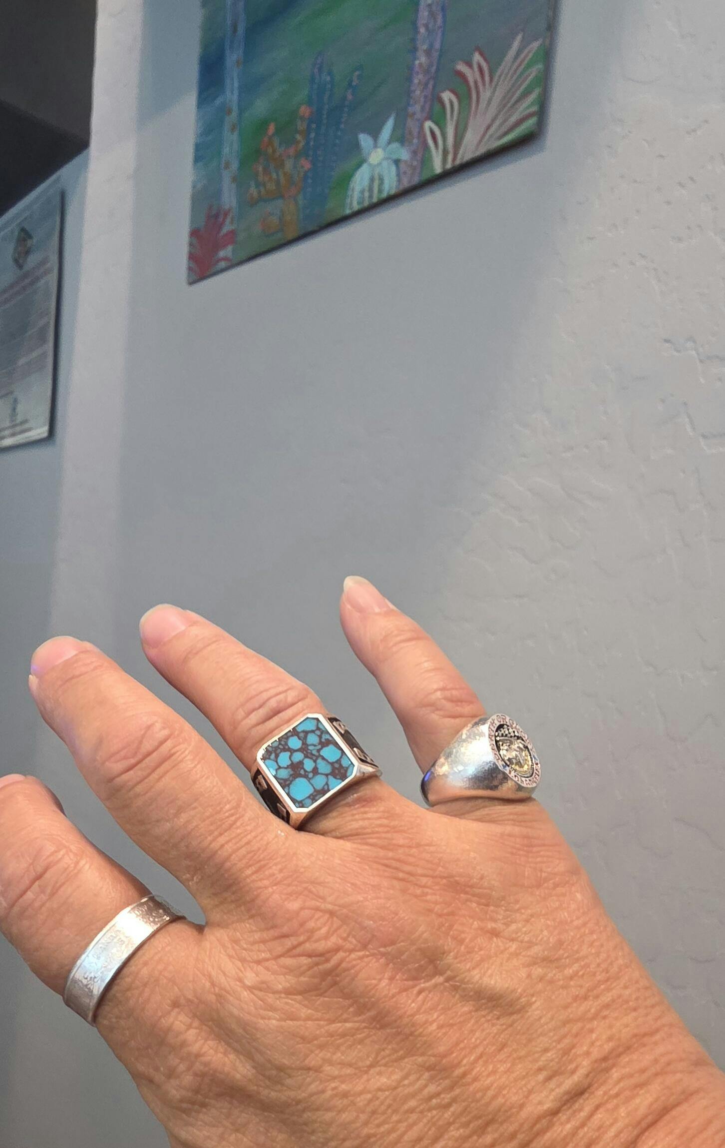 Featuring a beautiful semi precious 100% natural Nevada Turquoise stone hand cut and bezel set.