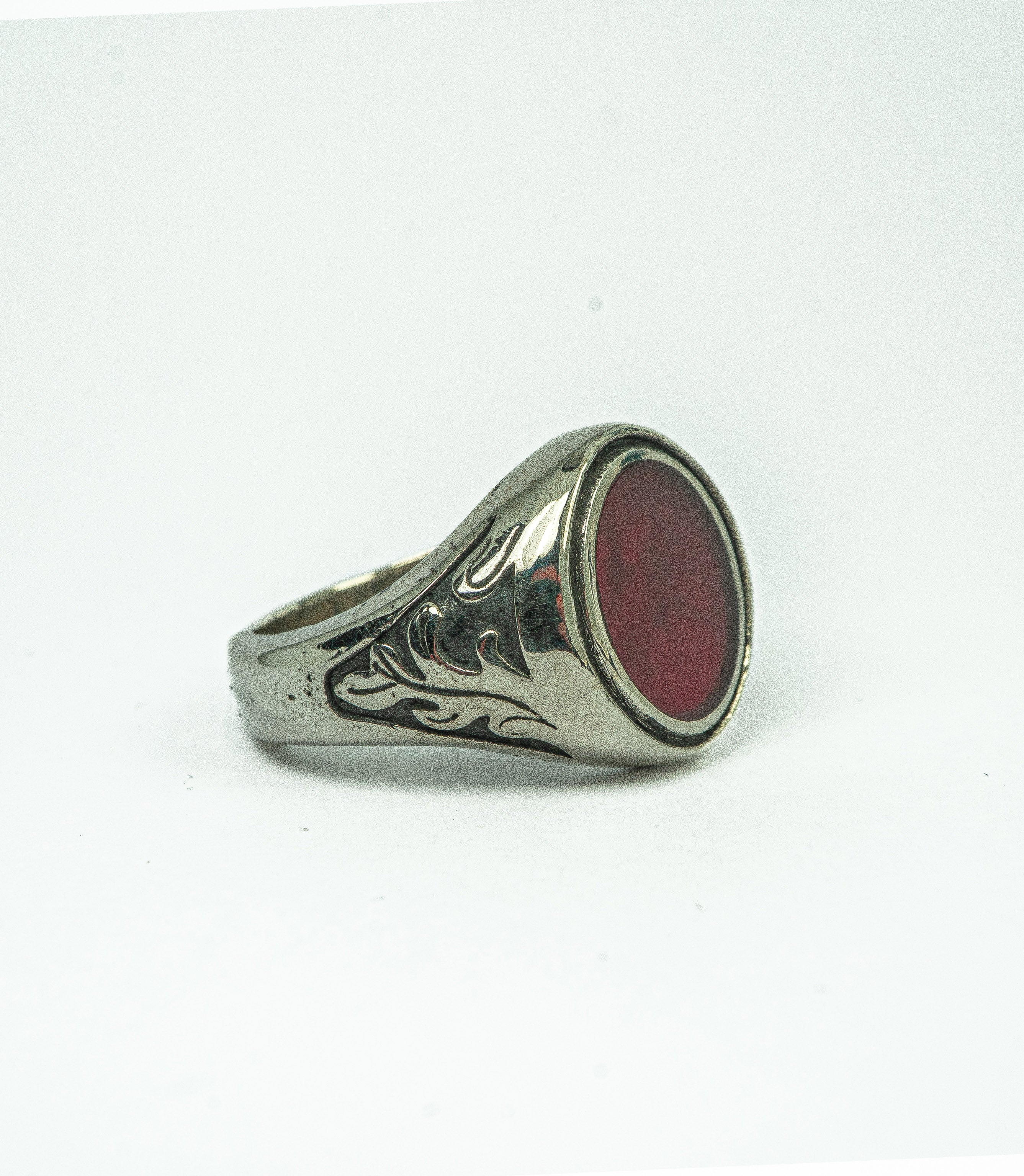 A heavy-set signet ring marked by hand-carved flame details along the band.