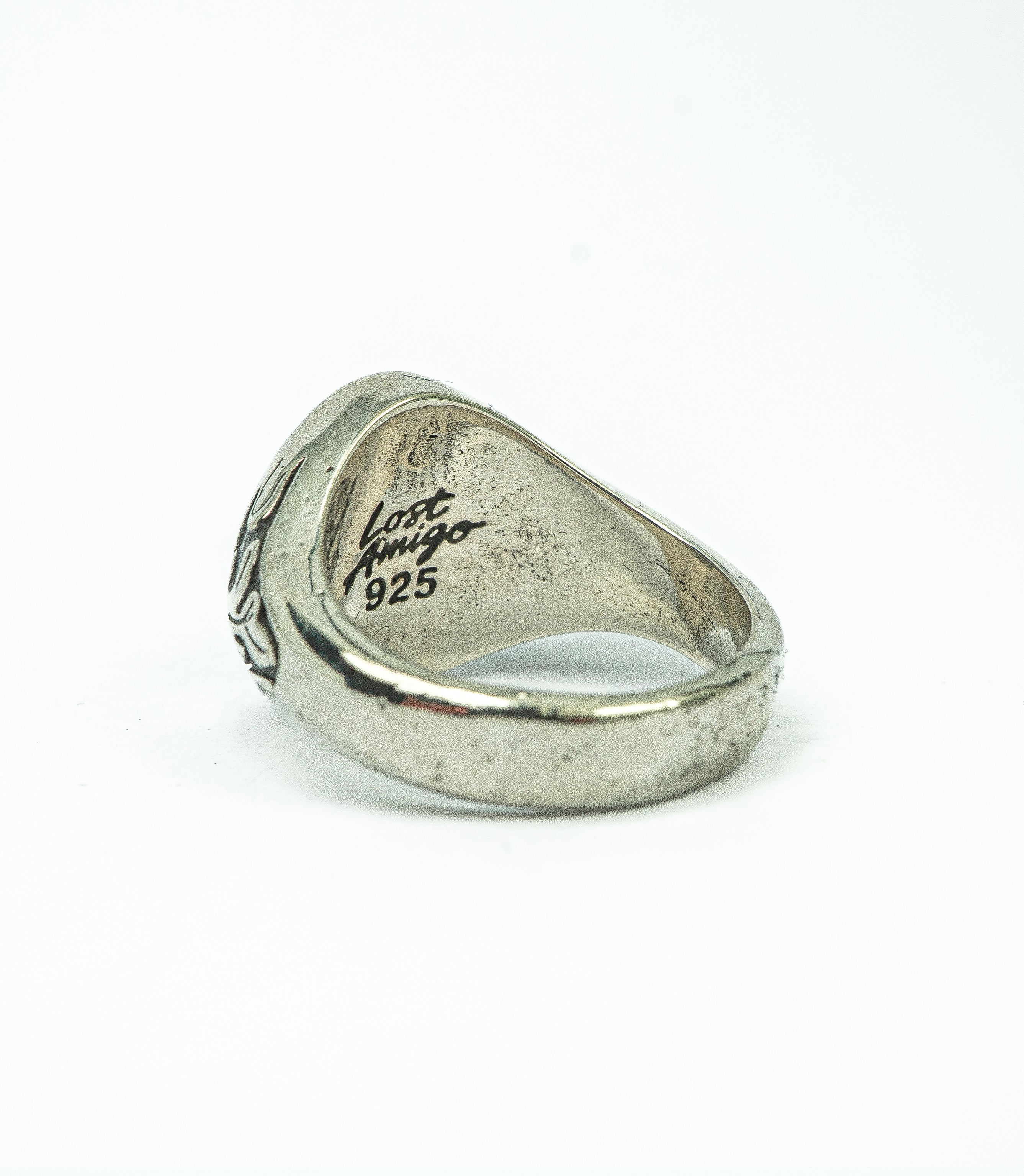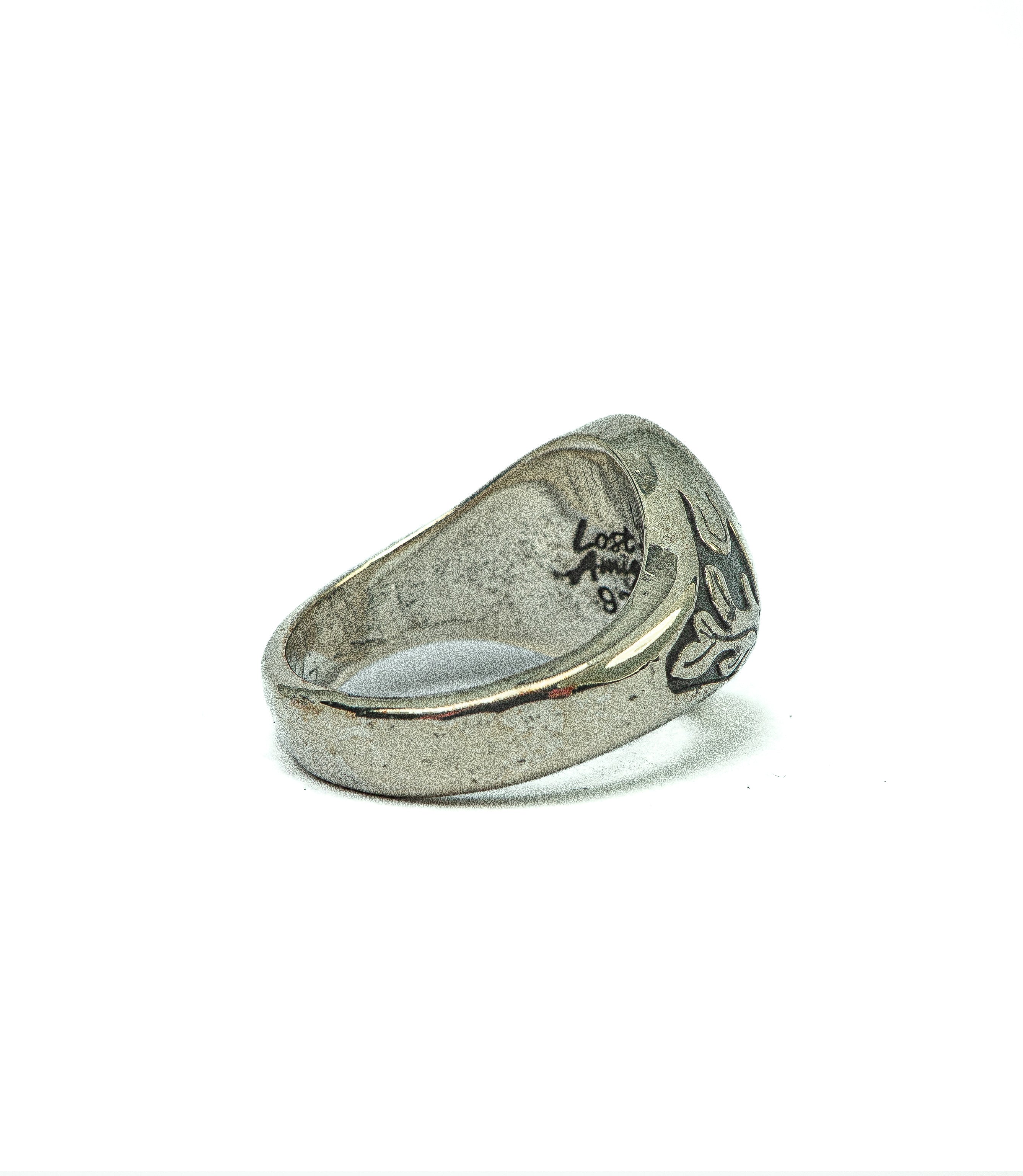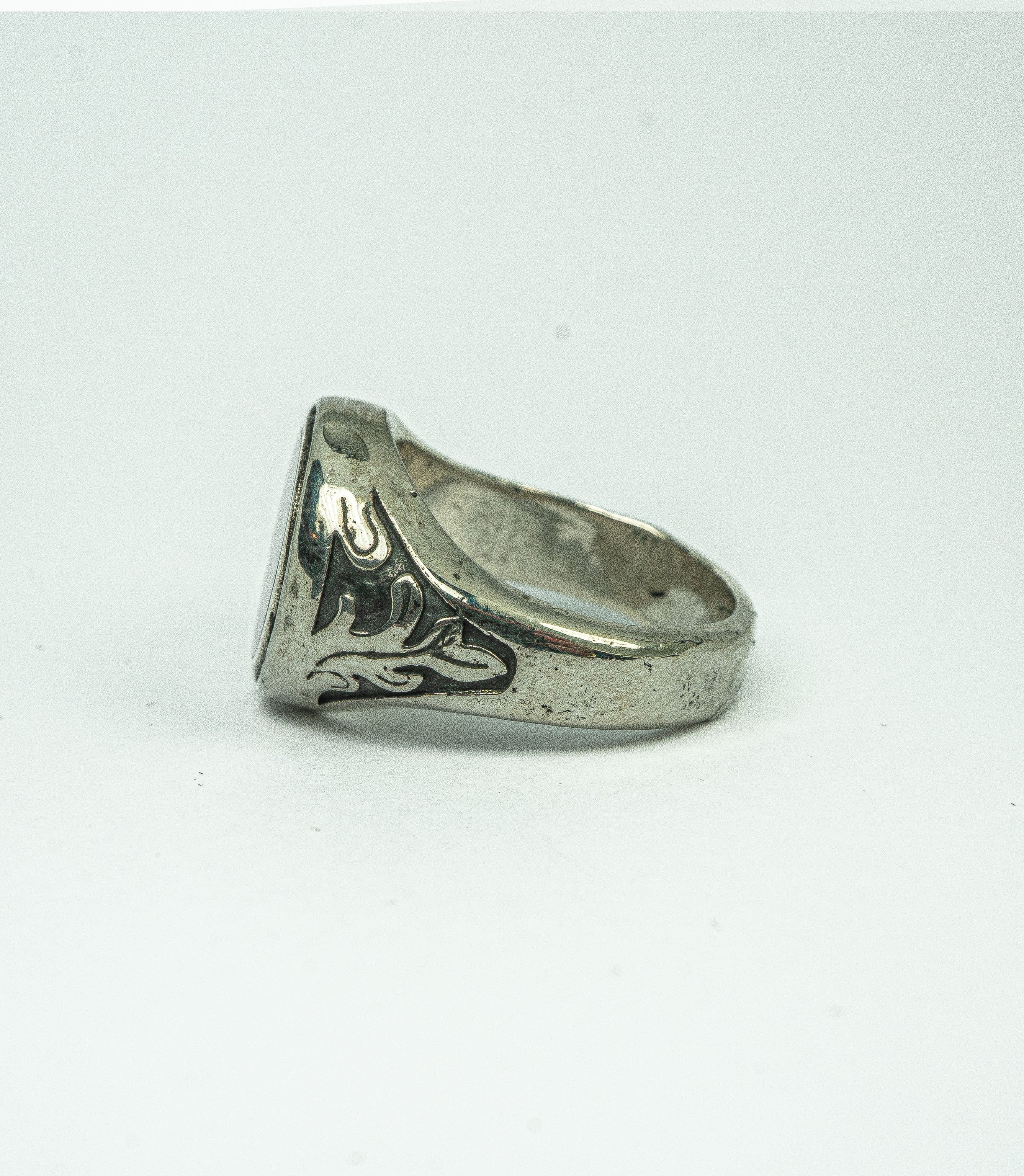 A heavy-set signet ring marked by hand-carved flame details along the band.